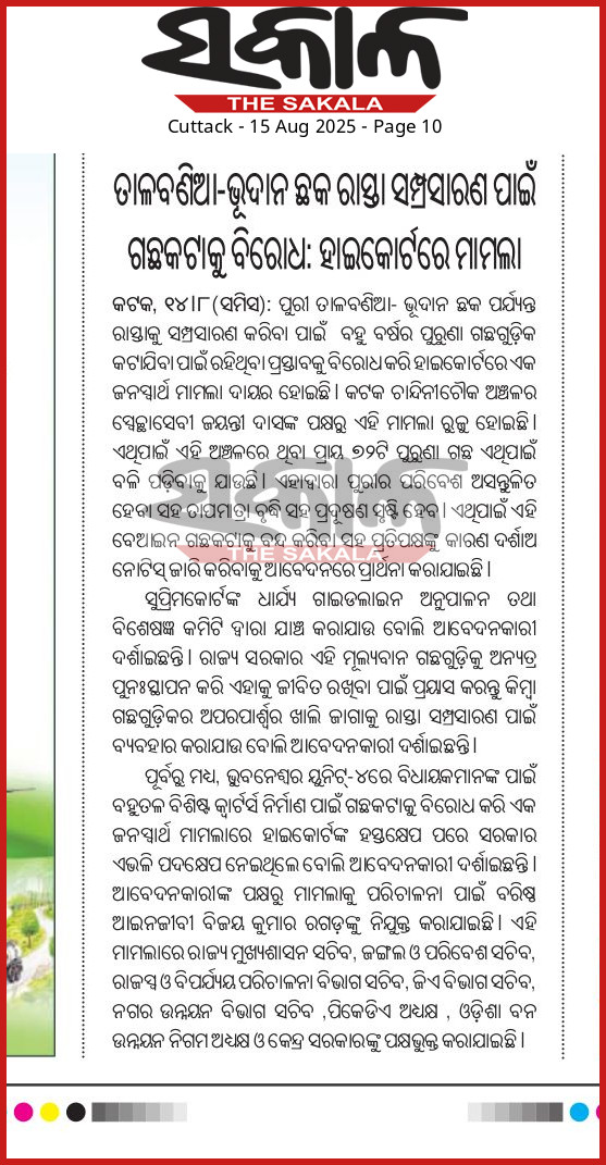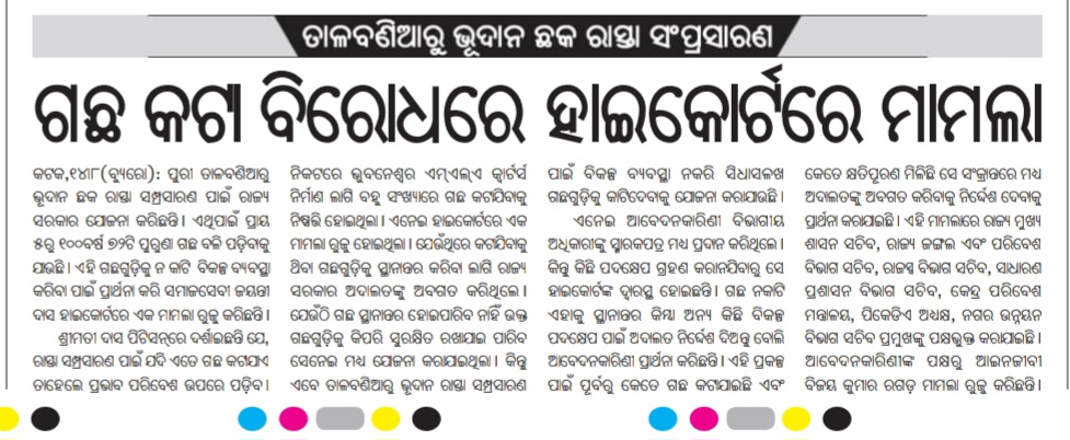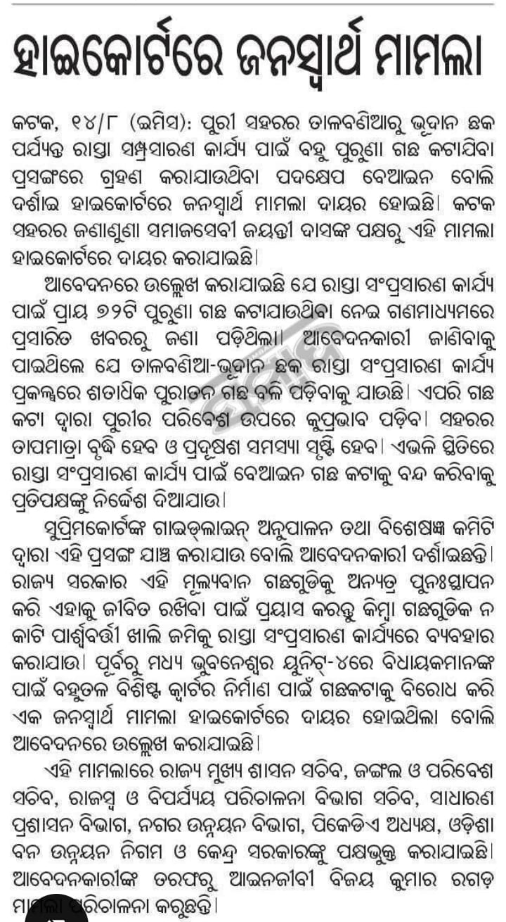 WPC PIL 22791 OF 2025 FILED IN HON’BLE HIGH COURT OF ORISSA IN THE MATTER OF AN APPLICATION CHALLENGING INACTION OF AUTHORITY IN NOT TAKING APPROPRIATE STEPS FOR DAMAGING TO THE ENVIRONMENT AND CLIMATE CHANGE DUE TO CUTTING OF AGE OLD TREES DUE TO EXPANSION OF ROAD FROM TALABANIA TO BHOODAN CHHAK IN PURI AND AN APPLICATION PRAYING FOR ISSUANCE OF AN APPROPRIATE WRIT OF MANDAMUS OR ORDER OR DIRECTION IN THE NATURE OF MANDAMUS OR ANY OTHER ORDER TO THE OPP. PARTIES TO STOP 2 DESTRUCTION OF TREES FOR THE PURPOSE OF EXPANSION OF ROAD FROM TALABANIA TO BHOODAN CHHAK IN PURI AND INTERGENERATIONAL EQUITY OF LIVING ENTITIES UNDER ARTICLES, 14, 19, 21 AND 48-A OF THE CONSTITUTION OF INDIA